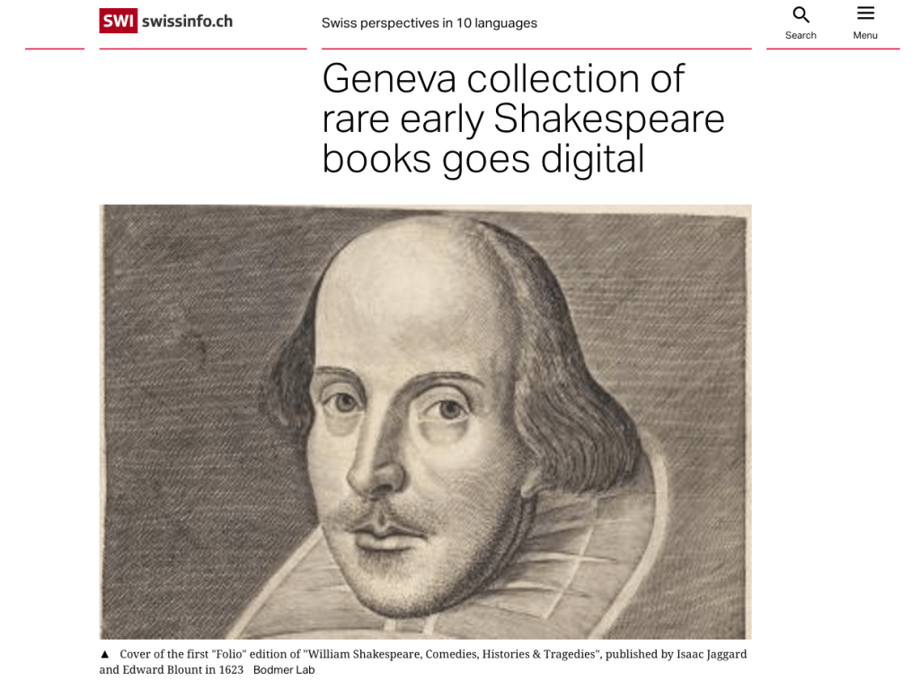 The Bodmer Foundation in Cologny, Geneva, counts among its vast library of world literature a collection of 174 early modern English books dating from between the late fifteenth and the end of the seventeenth century. Particularly remarkable in the collection is the greatest set of early Shakespeare editions outside the English-speaking world, which have recently been digitised by the Bodmer Lab and made freely available online.